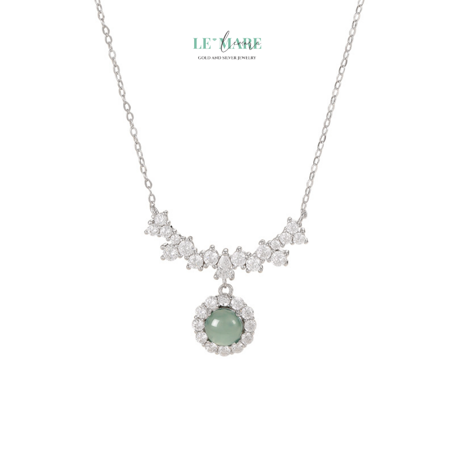 Chiếc dây chuyền ngọc bích nữ này được chế tác tỉ mỉ từ bạc cao cấp, giữ vững màu sắc thanh khiết và sang trọng. Phần mặt dây là hình ảnh mặt trời cách điệu, bao quanh viên ngọc bích xanh lục – như thể bình minh đang hé rạng giữa trời xanh. Thiết kế vừa tối giản vừa nghệ thuật, dễ dàng kết hợp với mọi phong cách thời trang – từ thanh lịch công sở đến dịu dàng dạo phố.