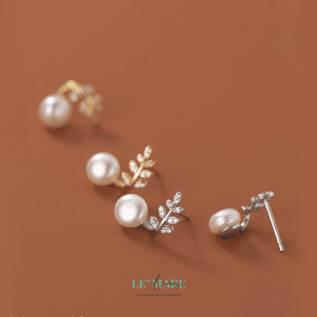 Khuyên bạc S925 với thiết kế chiếc lá nạm đá gắn ngọc sang trọng sẽ là sự điểm nhấn nổi bật.