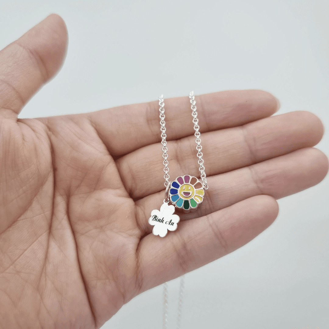 Dây chuyền mo bạc ta mặt cười bông hoa mix charm cỏ bốn lá khắc tên cho bé Le’Mare Jewelry đáng yêu, xinh xắn, tô điểm trên chiếc cổ nhỏ xinh của con, là món quà đầy ý nghĩa cho trẻ trong những dịp đặc biệt như thôi nôi, đầy tháng, sinh nhật, tết Trung Thu,…