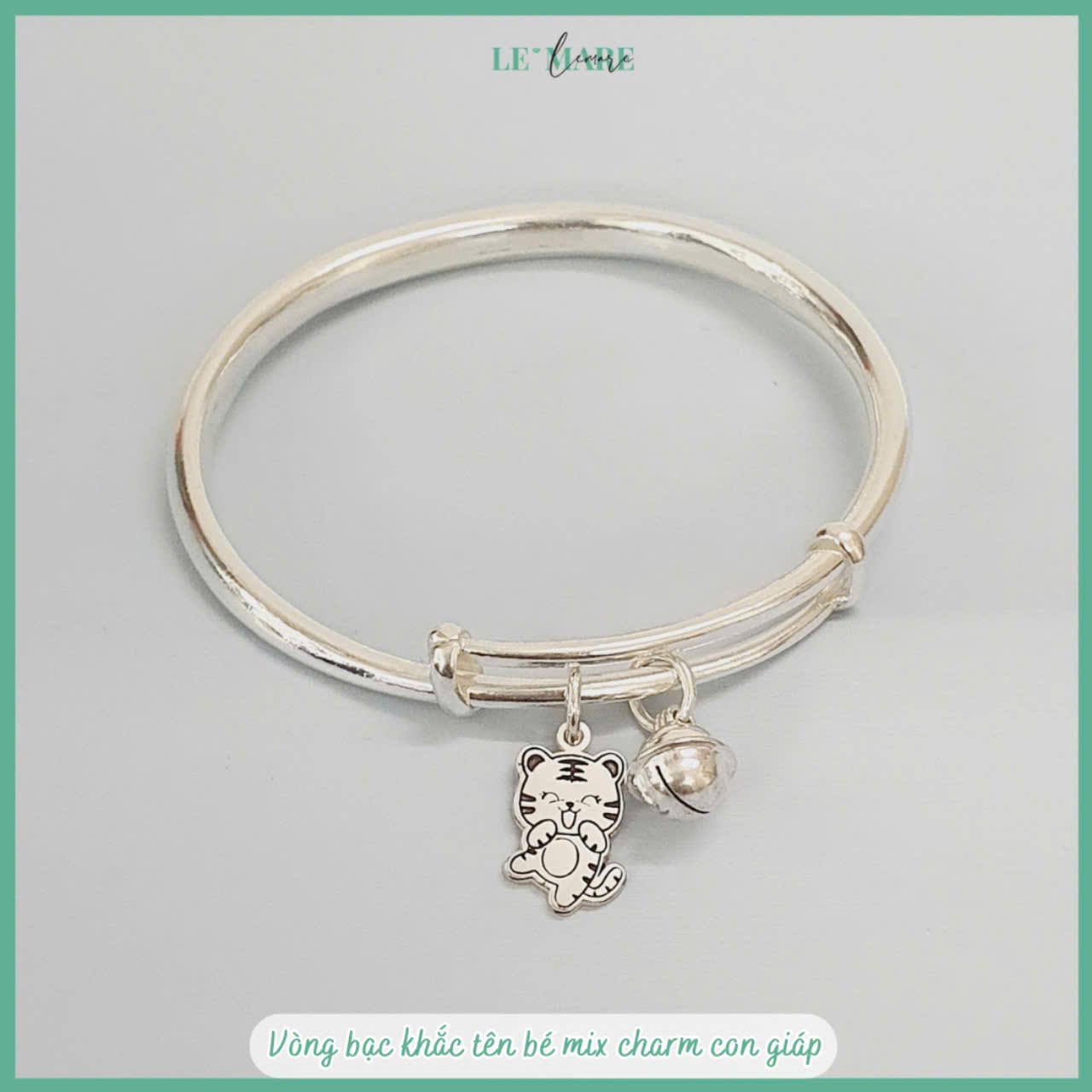 Vòng bạc ta PN01 khắc tên mix charm con giáp và chuông Le’Mare Jewelry mang vẻ đẹp đáng yêu, các chi tiết được mài dũa cẩn thận, an toàn tuyệt đối cho bé.