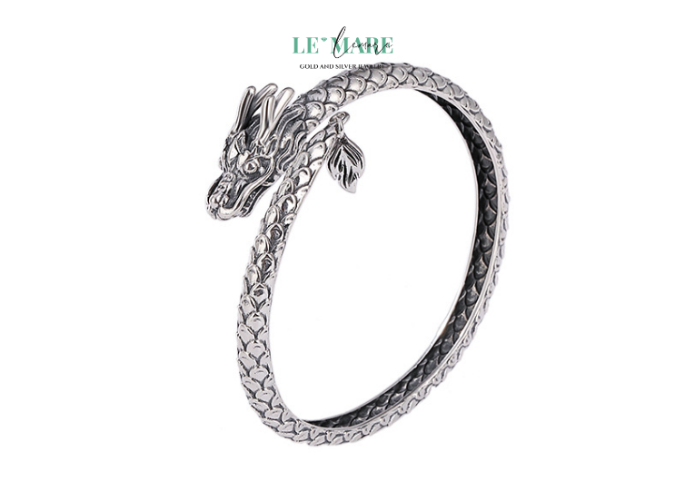 Chiếc vòng tay được chế tác từ bạc cao cấp, với đường nét uốn lượn như thân rồng bay lượn giữa mây trời. Mỗi chi tiết đều được nghệ nhân trau chuốt, mô phỏng sống động vảy rồng, sừng rồng, đuôi rồng… nhưng vẫn giữ được sự nhẹ nhàng và thanh lịch khi đeo.
