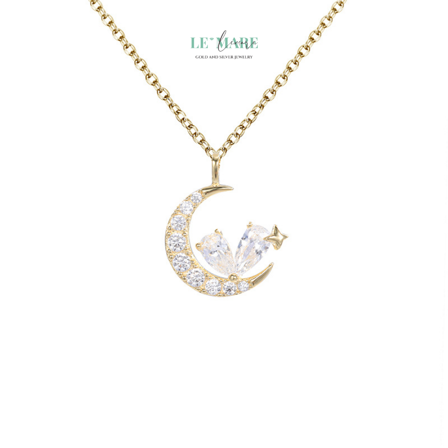 Phần mặt dây được chế tác tỉ mỉ, mô phỏng ánh trăng tròn vẹn bên cạnh cánh bướm thanh thoát, tạo nên sự đối lập hài hòa giữa ánh sáng và chuyển động, giữa tĩnh lặng và sống động – tượng trưng cho nội tâm phong phú, sâu lắng nhưng luôn khát khao được yêu thương.