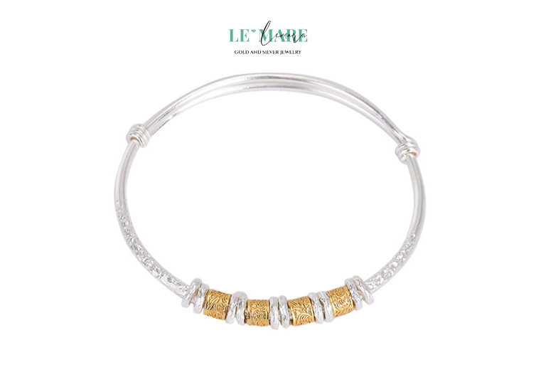 Chiếc vòng được chế tác từ bạc 999 – chất liệu sáng bóng, bền đẹp, an toàn cho làn da. Các viên vàng nhỏ được đính một cách chắc chắn, góp phần tạo nên một thiết kế vừa hiện đại vừa có chiều sâu thẩm mỹ.