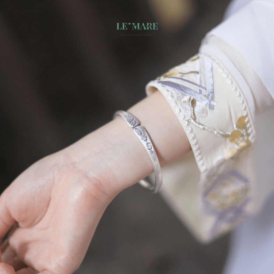 Ngay từ cái nhìn đầu tiên, vòng tay bạc nữ Vân Tước đã khiến người ta mường tượng đến dải lụa lướt nhẹ qua cổ tay thiếu nữ. Bề mặt bạc được uốn lượn vừa vặn, không sắc cạnh, tạo cảm giác êm ái khi đeo. Trên thân vòng, những hoa văn được khắc họa uyển chuyển như cánh chim trong gió – không quá rườm rà, nhưng đầy tinh tế.