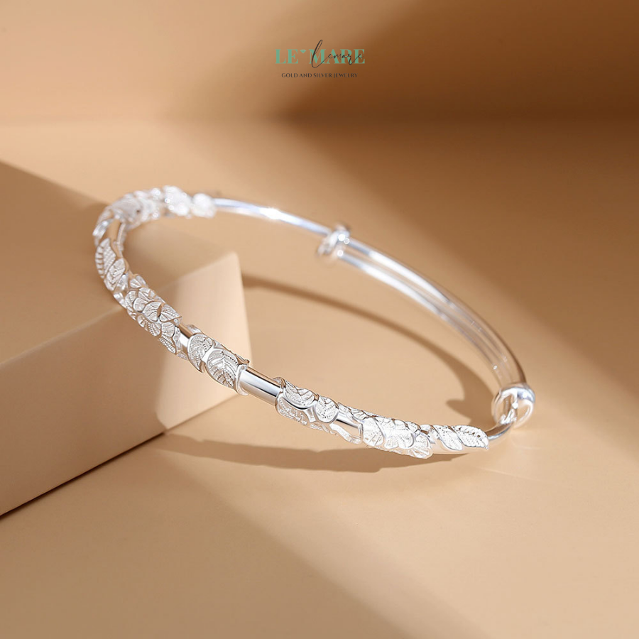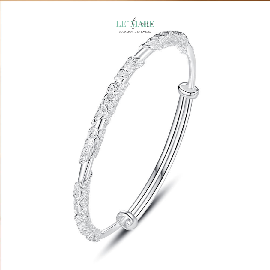Với hình ảnh hoa lá tinh tế, chiếc vòng tay này mang trong mình vẻ đẹp tự nhiên, dịu dàng của mùa xuân. Hình ảnh hoa như một lời mời gọi sự tươi mới, rạng rỡ. Đó là sự khởi đầu của những cơ hội mới, của tình yêu và niềm hy vọng. Những chi tiết hoa lá được khắc họa tỉ mỉ, vừa đơn giản nhưng cũng không kém phần sang trọng, mang đến một vẻ đẹp đầy sức sống và nhẹ nhàng.