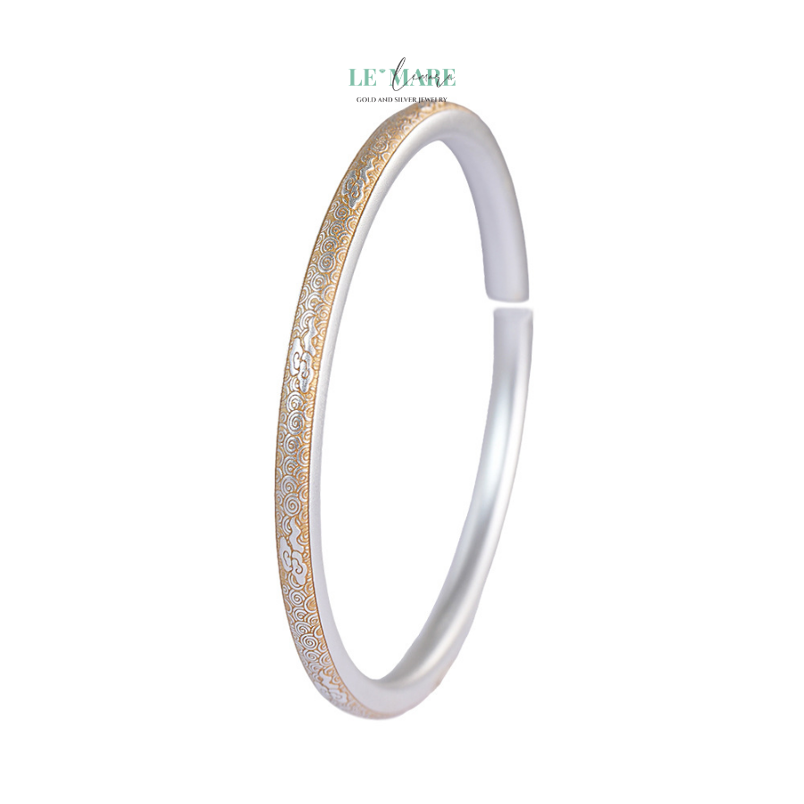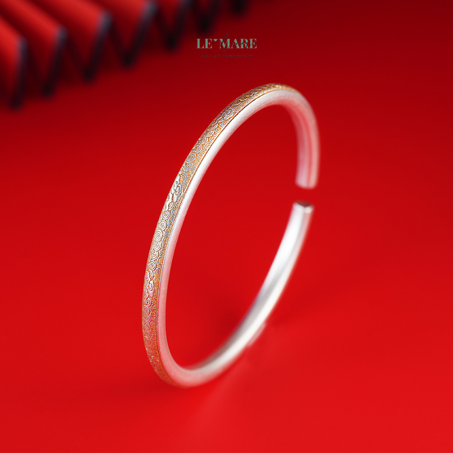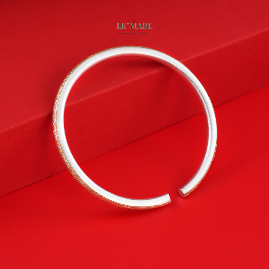 Vòng tay Bạch Hoàng được chế tác từ bạc đặc nguyên khối, bề mặt trơn láng, mềm mại như dòng nước lặng, với điểm nhấn hoa văn màu vàng tinh tế như vệt nắng nhẹ đầu đông. Từng đường nét được mài giũa kỹ lưỡng, nâng niu cổ tay người đeo như thể vòng tay sinh ra là để ở đó, là để hoàn thiện thần thái của một người phụ nữ đã đủ trải nghiệm, đủ yêu bản thân.
