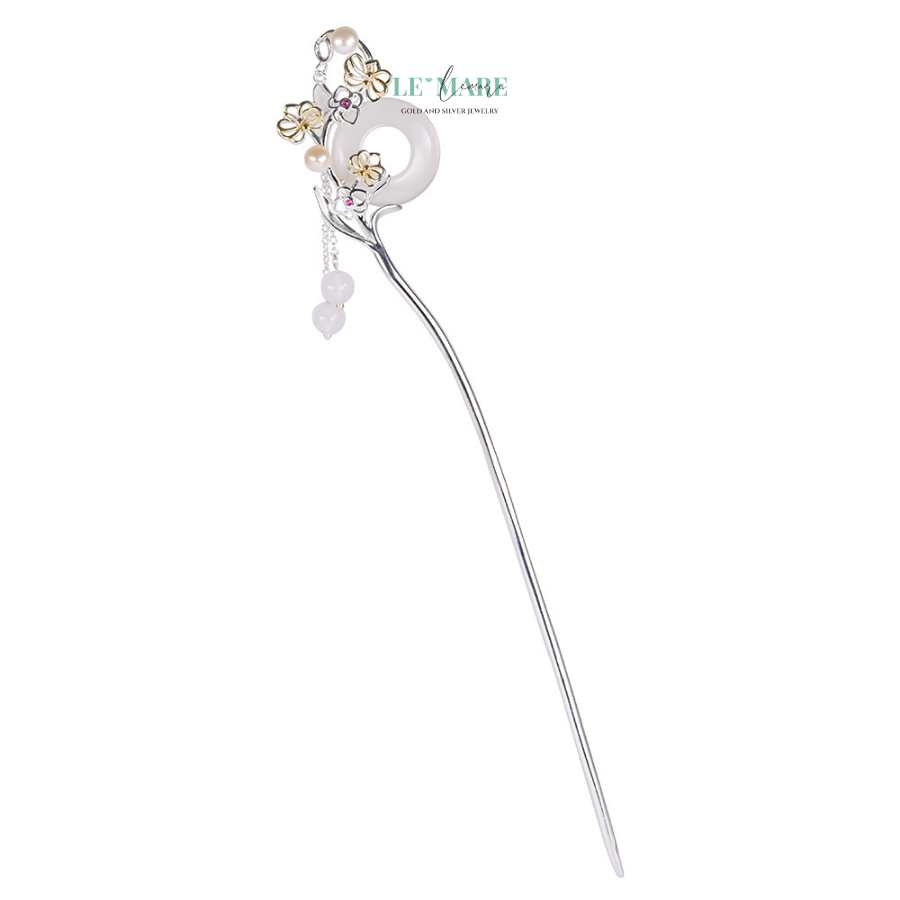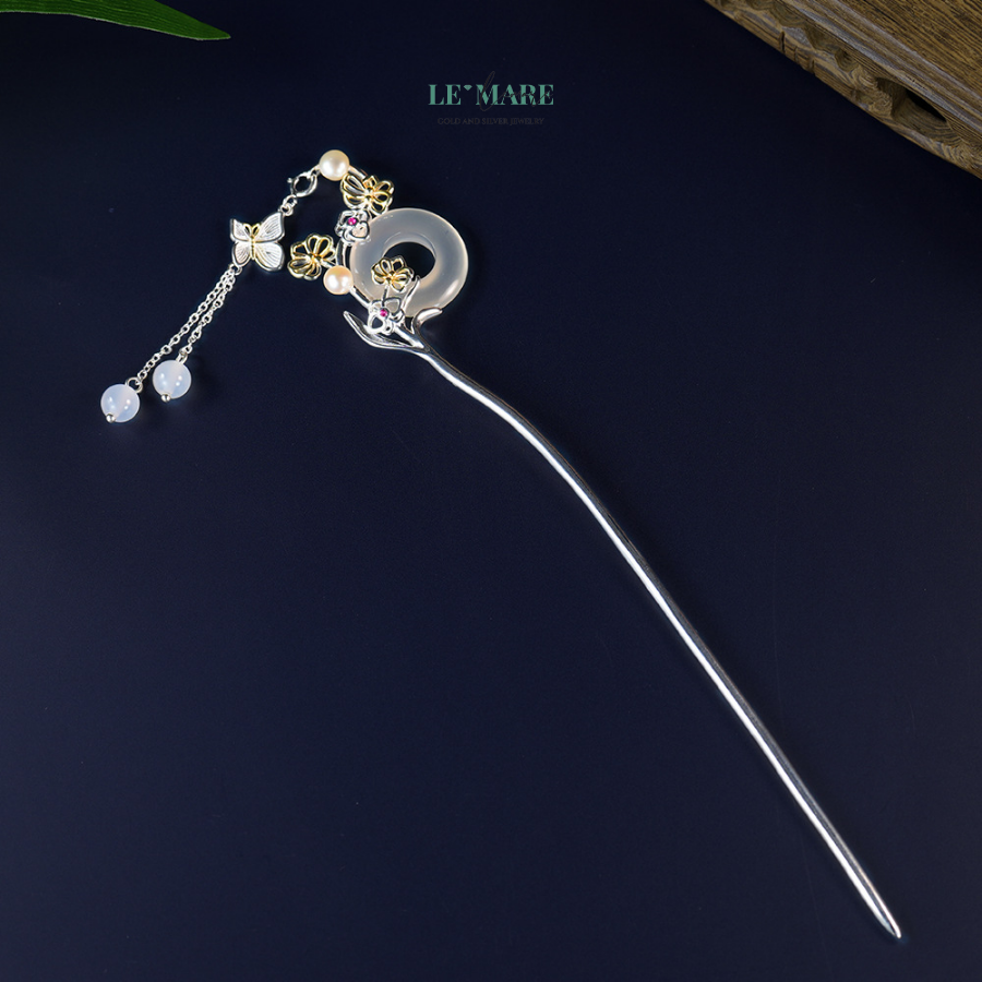 Trâm cài tóc Ngọc Hòa Điền Mặt Hồ Mùa Xuân từ Le’Mare LMJ là một tuyệt phẩm gợi nhắc đến hình ảnh mặt hồ trong vắt giữa mùa xuân, nơi từng làn gió nhẹ lướt qua làn nước, nơi những cánh bướm bay lượn hoan ca cùng hương sắc thiên nhiên. Món phụ kiện này là sự kết tinh giữa chất liệu ngọc quý và nghệ thuật chế tác tinh xảo – dành cho người phụ nữ yêu vẻ đẹp tinh tế, tĩnh lặng và đầy chất thơ.