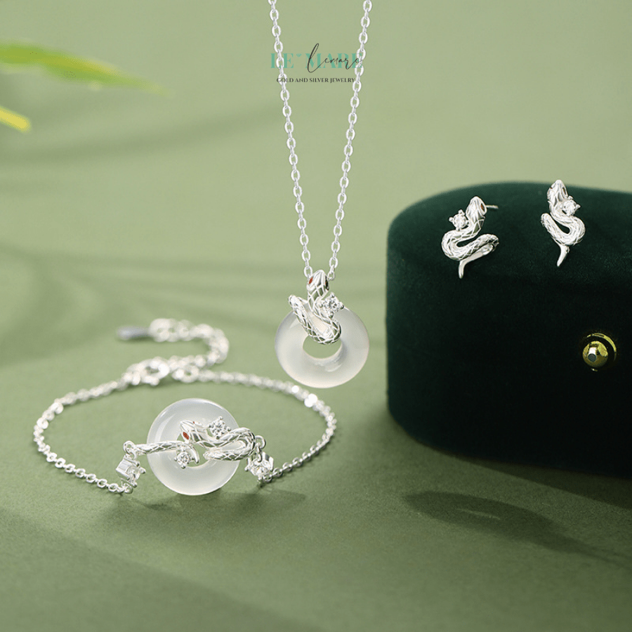 Uẩn Xà là chiếc vòng tay bạc nữ mang hình tượng rắn quấn quanh viên ngọc bích, tạo thành một tổng thể vừa mềm mại, vừa mạnh mẽ. Trong nhiều nền văn hóa phương Đông, rắn không chỉ là biểu tượng của sự biến hóa, quyền lực mà còn đại diện cho trí tuệ sâu xa, cho bản năng sinh tồn và bảo vệ. Khi kết hợp với ngọc bích – loại đá quý được mệnh danh là “ngọc của trời đất” – chiếc vòng trở thành bức tranh phong thủy sống động, gửi gắm nhiều tầng ý nghĩa.