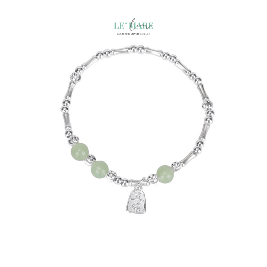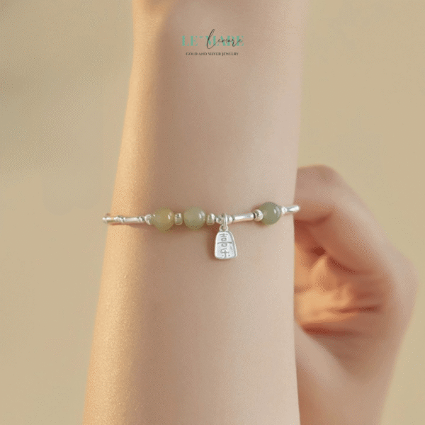 Phần lắc tay bằng bạc được chế tác trơn tinh tế, làm nổi bật sắc ngọc mà không át đi vẻ đẹp thuần khiết của nó. Sự kết hợp này tượng trưng cho mối giao hòa giữa nội tâm vững vàng và vẻ ngoài dịu dàng – phẩm chất đáng trân quý của người phụ nữ hiện đại.